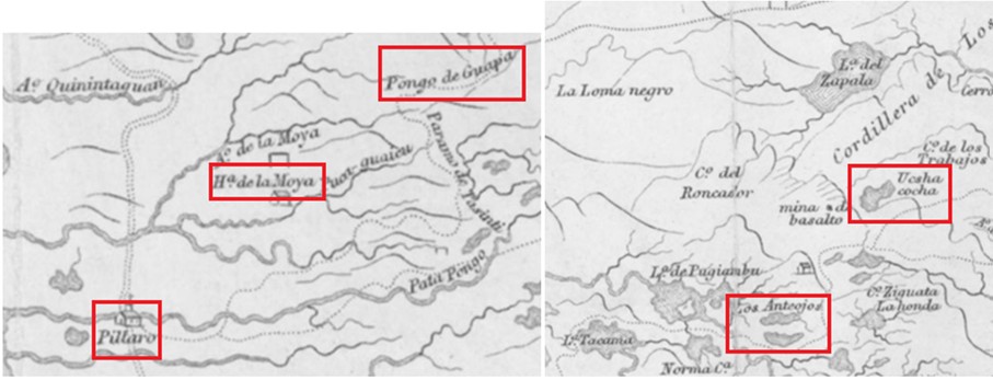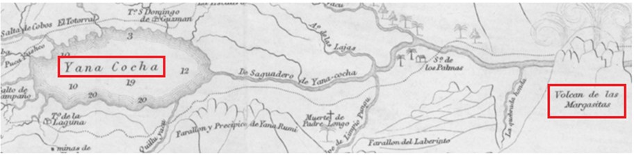 1Sangurimas: Bäume mit weißem Laub?  Vermuliche ist der  Rio Sangurima gemeint. Nach dem schwarzen See (siehe Nr. 3) nimmt der Fluss den Namen Desaguadero de Yana-cocha an und weiter unten den Namen Rio de las Sangurimas. 2Flechas: riesiges Pfeilrohr, Gynerium saccharoides; 3Yana-cocha (Schwarzer See),ein großes Gewässer, anderthalb Meilen lang und zwei Meilen breit.