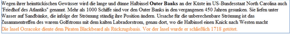 Die Einzelheiten darüber, wie das Schiff auf Grund lief, sind aber nicht genau bekannt. Eine Theorie besagt dass Blackbeard nur ein weiteres Opfer der tückischen Sandbänke an der Mündung der Beaufort-Bucht war, die bei Stürmen dazu neigen, sich zu verschieben (siehe Bild unten). Nach fast 300 Jahren im Jahr 1996 wurden vor North Carolina möglicherweise die Überreste der „Queen Anne’s Revenge“ entdeckt. Das Wrack liegt weniger als anderthalb Meilen vom Ufer entfernt etwa 25 Fuß unter Wasser. Der Untergang der Queen Anne’s Revenge war das, was Archäologen als „gewaltlosen Schiffbruch“ bezeichnen, was bedeutet, dass die Piraten ausreichend Zeit hatten, ihre Beute abzuladen. Bis auf ein wenig Goldstaub – weniger als eine Unze – wurde an Bord des Schiffes kein Schatz gefunden. Die Archäologen haben im Wrack und um das Wrack herum jedoch Hunderte von historischen Gegenständen gefunden, darunter einen verzierten Schwertgriff aus Eisen und Kupfer. Doch keines der vielen gefundenen Gegenstände beweist die Identität des Schiffes. Obwohl die datierbaren Artefakte bis in die Jahrzehnte vor dem Untergang des Schiffes zurückverfolgt werden können (jedes Datum nach Juni 1718 wäre ein aussagekräftiger Gegenbeweis dafür dass es sich bei dem Wrack um Blackbeards Schiff handelt), gibt es keine schlüssigen Erkenntnisse. Doch die allgemeine Lage des Wracks, stimmt mit den historischen Berichten und antiken Karten überein. Hinzu kommt die schiere Größe des Dreimastschiffs, die es zu einem ungewöhnlichen, wenn nicht sogar einzigartigen Besucher der wenig befahrenen Beaufort-Bucht gemacht hätte. Das Schiff war mit mindestens 25 Kanonen bewaffnet (obwohl die La Concorde nur 16 an Bord hatte), aber möglicherweise haben die Piraten einige eigene hinzugefügt. Es wurden auch Artefakte gefunden die auf eine mögliche Verbindung zur Vergangenheit des Schiffes als französischer Sklavenhändler schließen lassen. So wurden Glasperlen geborgen, wie sie in Afrika häufig gehandelt werden. Außerdem wurde in den Sedimenten rund um das Wrack Goldstaub gefunden, der Teil der Ladung der La Concorde gewesen sein könnte. Ferner wurden mehrere Objekte mit der Inschrift „Lilie“ geborgen – ein Symbol, das oft, wenn auch nicht ausschließlich, mit Frankreich in Verbindung gebracht wurde. Vom Schiff blieb nur einige vom Sand bedeckte Teil Holzplanken erhalten. Die Archäologen fanden ein 3.000 Pfund schweres Stück des Hecks. Auf diesem befanden sich zwei Tiefgangsmarkierungen, die anzeigen sollten, wie tief das Schiff unterhalb der Wasserlinie lag. Während solche Messungen für die Navigation von entscheidender Bedeutung waren, schienen die Werte dieses Schiffes keinen Sinn zu ergeben. Die Markierungen lagen zwischen 12,75 Zoll. Das überzeugendste Argument, dass es sich bei dem Wrack nicht um Blackbeards Schiff handelte, findet sich jedoch auf einem Kanonenrohr, das ziemlich grob mit drei sehr großen Zahlen – 1,7,3 – und einer etwas kleineren 0 gekennzeichnet ist. Wenn diese Zahlen ein Datum, 1730, bedeuten, wäre es das Ende für die Blackbeard-Theorie bedeuten. Die Archäologen meinen jedoch, dass sich die Zahl eher auf ein veraltetes Gewichtssystem oder vielleicht auf eine Katalognummer bezieht. Die Gerüchte dass sich ein Schatz im Wrack seines letzten Schiffes, der Queen Anne’s Revenge, verbirgt, konnten bisher nicht verifiziert werden. Es ist ja noch nicht einmal sicher ob es sich bei dem Schiff das vor der Küste von North Carolina versenkt wurde tatsächlich um Blackbeards Schiff handelt.