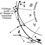 Der Tierkreis (Zodiak) ist ein Streifen von ±10° um die scheinbare Sonnenbahn (Ekliptik), in dessen Mitte (±5° um die Ekliptik) sich Mond und Planeten bewegen. Die Tierkreiszeichen sind nach 12 der Sternbilder benannt, die vor 2000 Jahren in diesen Abschnitten des Tierkreises (Koordinatensystems) standen. Der Tierkreis leitet sich ursprünglich von der mathematischen babylonischen Astronomie in Kombination mit dem babylonischen Mondkalender ab. Er wurde im ausgehenden 5. Jahrhundert v. Chr. von babylonischen Astronomen als Koordinatensystem definiert und enthält daher überwiegend babylonische Sternbilder. Die griechische Astronomie übernahm diesen babylonischen Tierkreis, und entwickelte ihn weiter zum heute bekannten Tierkreis. Der griechische Astronom Hipparchos von Nicäa (* um 190 v. Chr. ; † um 120 v. Chr.) entdeckte im 2. Jh. v. Chr. dass die Erdachse ihre Richtung ändert, was eine Folge der Massenanziehung des Mondes und der Sonne ist. Die Richtungsänderung äußert sich durch das Fortschreiten des Frühlingspunkts entlang der Ekliptik, woraus sich auch die Bezeichnung Präzession (lateinisch für ‚Fortschreiten‘) herleitet. In der Folge wurde schnell klar, dass die Sternbilder sich gegen die Sternzeichen (Abschnitte des Koordinatensystems) sukzessive verschieben. Daher konnten die Sternbilder nicht wirklich etwas mit den 12 Monaten des Jahres zu tun haben. In der späten Antike einigte man sich deshalb darauf, die Tierkreiszeichen unabhängig von den Sternbildern zu definieren. Beginnend mit dem Widderpunkt wurden sie seither als rein geometrische Kreis-Abschnitte zu je 30° auf der Ekliptik festgelegt, vor denen sich die Sonne nacheinander während eines Jahres zu je einem Zwölftel der Jahreslänge befindet. Die Frühlingstagundnachtgleiche (= Frühlingsäquinoktium) markiert den Beginn des Tierkreises. Sie fällt auf den 19., 20. oder 21. März. Die Mittellinie des Zodiaks wurde von den Griechen Ekliptik genannt, weil in ihr die Eklipsen, die Sonnen- und Mondfinsternisse stattfinden. Die Ekliptik dient als Messkreis für die Positionsbestimmung der Gestirne und der astrologischen Schnittpunkte Medium coeli (MC), Aszendent, Mondknoten und Widderpunkt. Es gibt zwei verschiedene Tierkreise, welche die Ekliptik in zwölf Tierkreiszeichen aufteilen: der tropische Tierkreis zu zwölf Abschnitten mit je 30° Kreisbogen auf der Ekliptik, der sich astronomisch an den Äquinoktien (= Tagundnachtgleiche) und Sonnenwenden (= der höchste beziehungsweise der niedrigste mittägliche Sonnenstand) ausrichtet und den siderischen Tierkreis, der sich an den – unterschiedlich großen – Sternbildern im Bereich der Ekliptik orientiert.